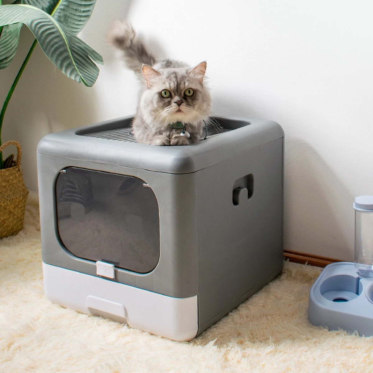 De luxe grijze kleur geeft deze kattenbak een modern uiterlijk.