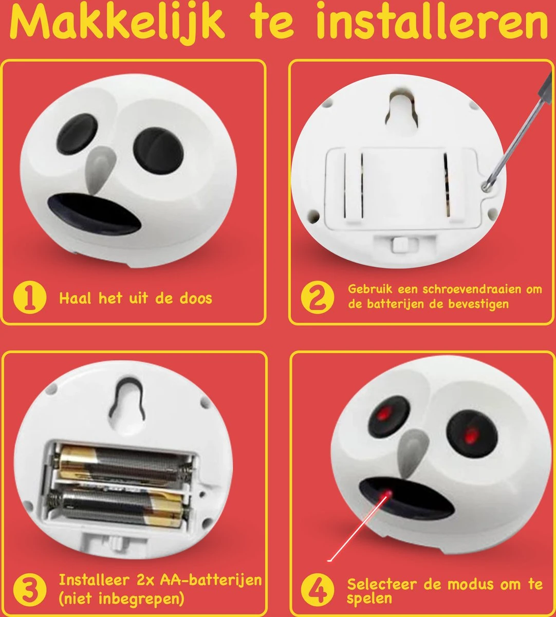 Je hoeft je geen zorgen te maken dat de laser in de ogen van je kat schijnt, omdat deze naar beneden gericht is. Het speeltje schakelt automatisch uit na 20 minuten speeltijd, om overmatig spelen te voorkomen. De Laser Uil werkt op 2 AA-batterijen (niet meegeleverd) en is gemakkelijk te bevestigen met de zuignap (niet inbegrepen).