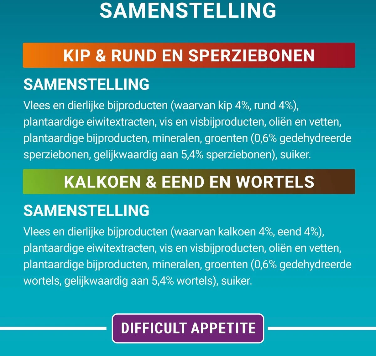 | Smaak dierenvoeding | Kip / Rund / Sperzieboon / Kalkoen / Eend / Wortel |
