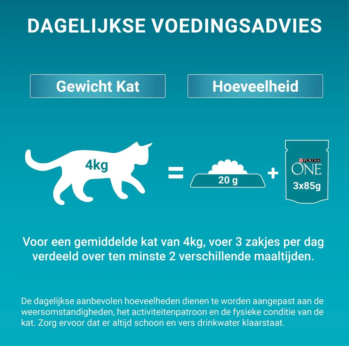 | Voedingsadvies | Voedingsadvies: Voor een gemiddelde kat van 4kg, voer 3 zakjes per dag verdeeld over ten minste 2 verschillende maaltijden. De dagelijkse aanbevolen hoeveelheden dienen te worden aangepast aan de weersomstandigheden, het activiteitenpatroon en de fysieke conditie van de kat. Serveer op kamertemperatuur. Zorg ervoor dat er altijd schoon en vers drinkwater klaarstaat. Als alternatief kan je dagelijks 2 zakjes geven gecombineerd met 25g droge brokjes van Purina ONE Adult kat. |