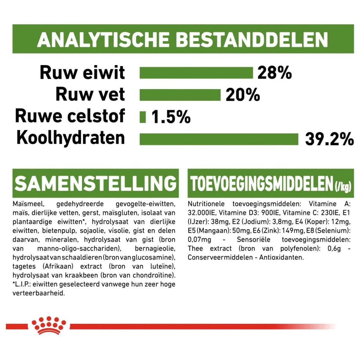 | Voedingswaarde | Samensteling: maïsmeel, gedehydreerde gevogelte-eiwitten, maïs, dierlijke vetten, gerst, maïsgluten, isolaat van plantaardige eiwitten*, hydrolysaat van dierlijke eiwitten, bietenpulp, sojaolie, visolie, gist en delen daarvan, mineralen, hydrolysaat van gist (bron van Manno-Oligo-Sacchariden), bernagieolie, hydrolysaat van schaaldieren (bron van glucosamine), tagetes (Afrikaan) extract (bron van luteïne), hydrolysaat van kraakbeen (bron van chondroïtine) |