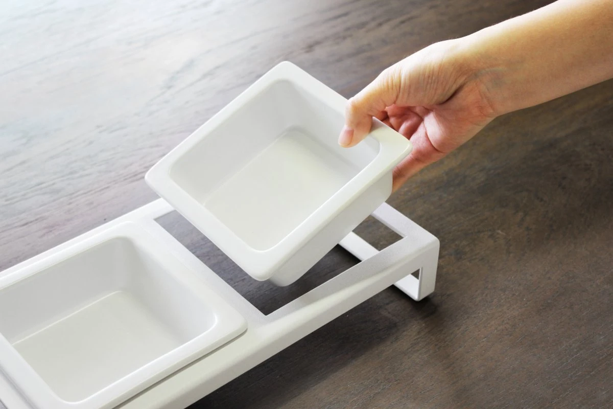 Tower dierenvoerbakjes van Yamazaki. Voederbakjes van keramiek, in een stalen houder. De witte dierenvoerbakjes van Yamazaki zijn een stijlvol alternatief die perfect passen in een modern interieur. Geschikt voor katten en kleine honden. Afmeting: 15,5 x 28,9 x 6,1 centimeter.